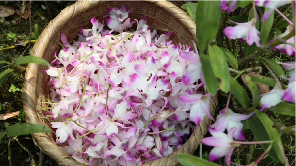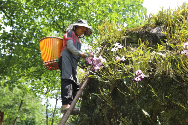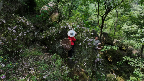 在凤鸣镇十里金钗桫椤谷,村民正在采摘金钗石斛花,这些石斛花会经过挑选、烘干等一系列处理工序,被做成花茶,卖到重庆、广东等地。