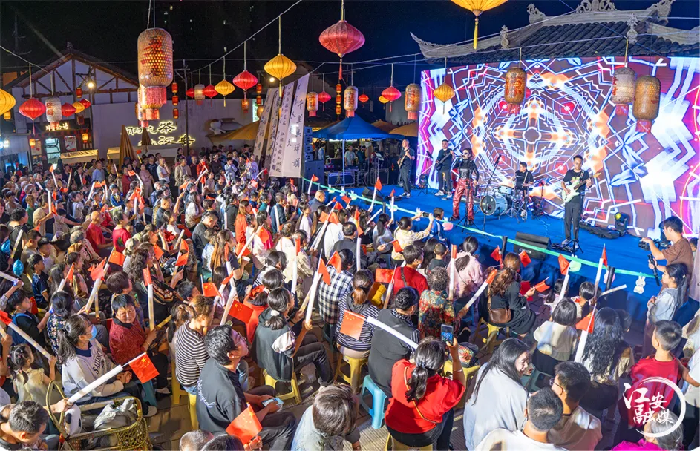 “如今在江安就能感受到浓厚的文化氛围,不用远行也能过得很有仪式感。”不少市民感叹道。假日期间的江安西街,化身为传统与潮流交织的舞台——潮流乐队与传统器乐同台献艺,酒茶文化与特色服饰在T台秀中巧妙融合;川剧变脸、清音等非遗曲艺,与摇滚、民谣等现代音乐形式轮番登场,精准覆盖不同年龄段游客的文化需求。