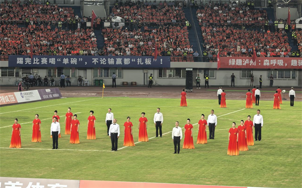 10月8日晚,在“川超”赛事的绿茵场上,泸州市老年大学声乐系60名银龄学员以“四渡赤水出奇兵”暖场节目惊艳亮相,为泸州队呐喊助威。