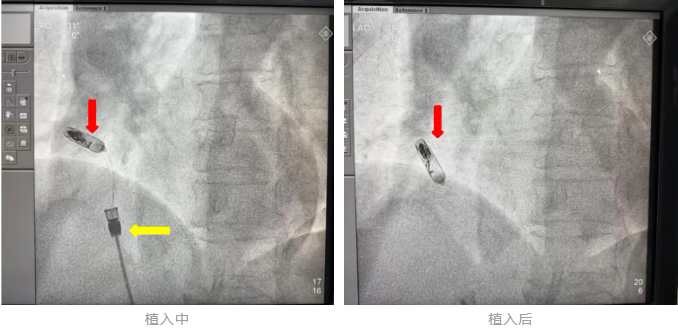注:红色箭头为无导线起搏器,黄色为递送系统术中影像