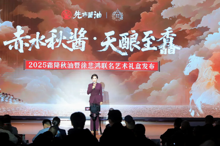 本届秋油大典还发布了先市酱油与徐悲鸿艺术基金会共同推出的“2025联名艺术礼盒”,礼盒巧妙融汇了徐悲鸿经典画作中的奔马、雄狮等元素,将东方美学之魂注入日常调味之中,让一瓶酱油成为可品鉴的艺术品。徐悲鸿先生后人、徐悲鸿艺术基金会副秘书长徐小阳先生亲临现场,为礼盒揭幕,并动情讲述了“传承”背后的故事。