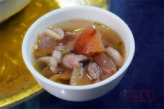 而要成就一锅地道的鹅片汤,步骤颇为重要。汤底是味道的根基——需先将菱角菜焯水,再用猪油爆香,随后加入清水,与酸萝卜、鹿茸菇一同,再添加味精、白醋、酸萝卜汁等调料熬煮二十多分钟,让配菜的风味充分融入汤中。