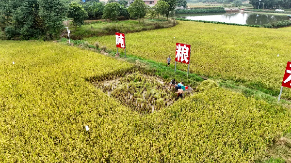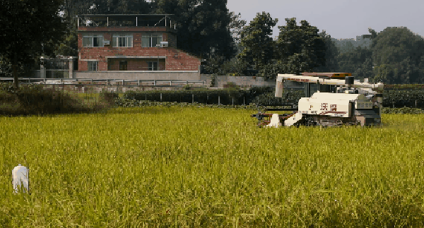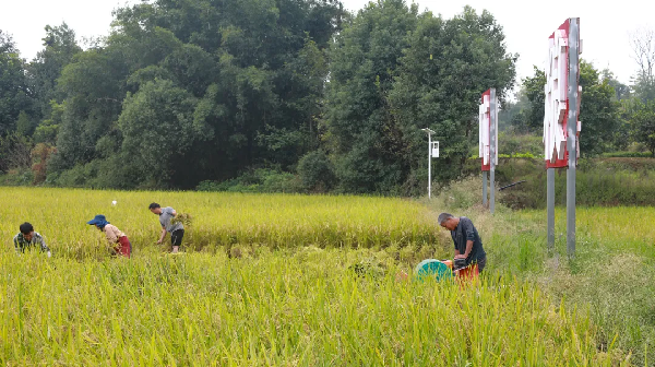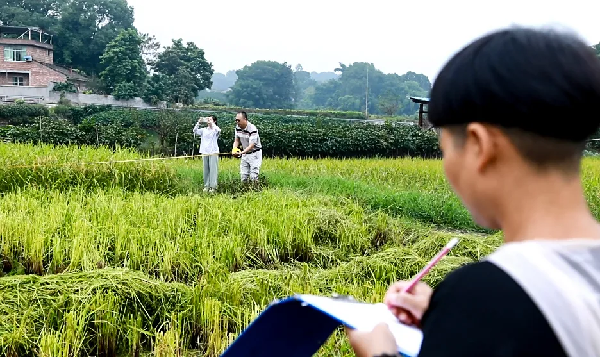 测产人员随机选取3个地块的水稻进行测产。田埂另一头,收割机正穿梭在稻田里。收割机所过之处,稻穗被快速收割、脱粒,稻草则被粉碎还田。