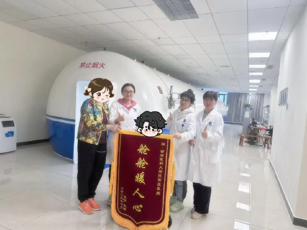 在最后几次的治疗中,小鹏的母亲将一面锦旗郑重地交到高压氧科团队手中,感激之情溢于言表。医护人员表示,将持续为更多需要的患者,提供好高压氧治疗服务,帮助他们缩短康复周期,重获健康与希望。