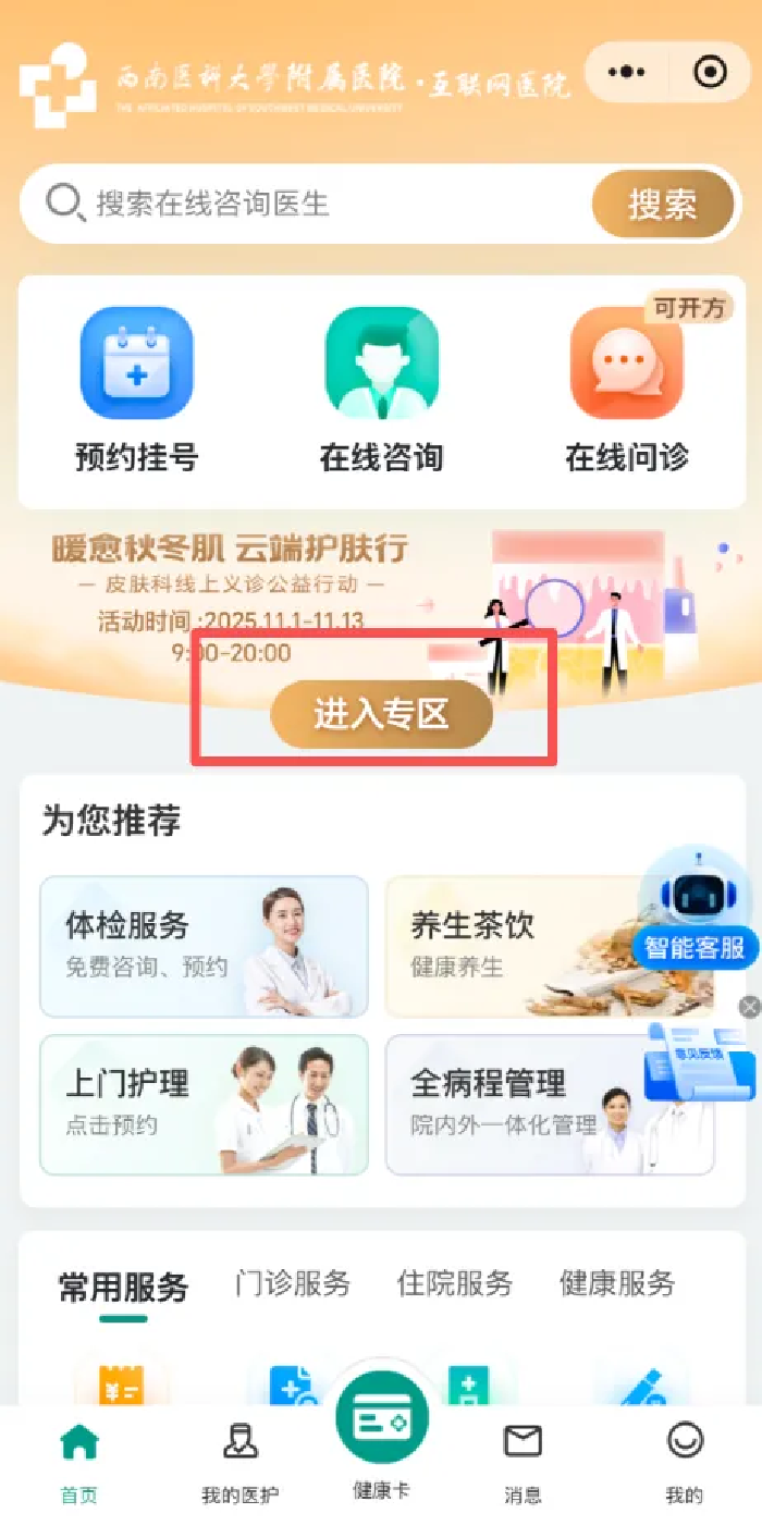 登录平台:通过医院官方公众号、互联网医院小程序进入“线上义诊”专区。