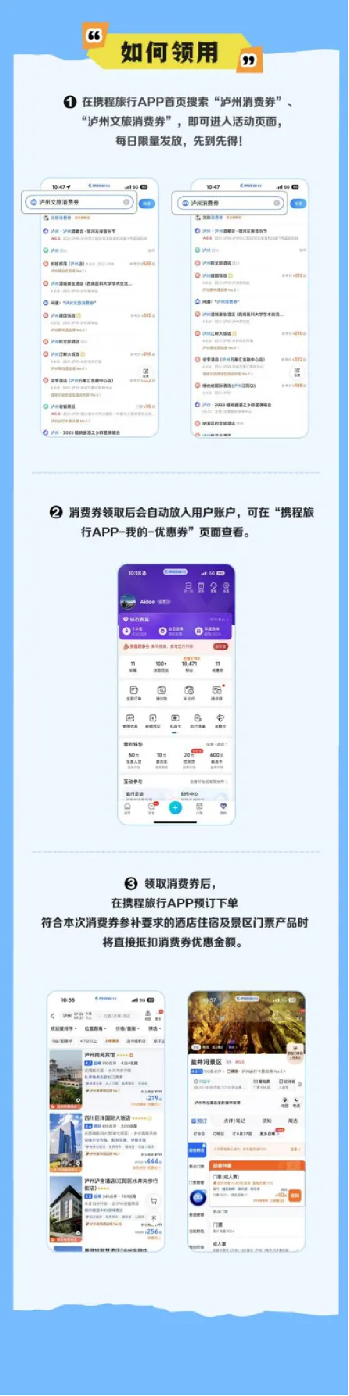 市内外游客在携程旅行APP、去哪儿旅行APP上预定11月11日—30日期间泸州星级旅游饭店、等级旅游民宿,按订单原价实行满150元减30元、满300元减60元、满500元减100元、满1000元减200元、满2000元减400元优惠。