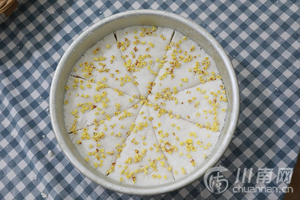 摘下清晨盛开的桂花,洗净晾干,准备好粘米粉、糯米粉、白糖等材料,搅拌均匀,取适量清水分次加入,搓揉成颗粒状,倒入模具中,轻轻铺平整,用小刀平均划成8份,撒上桂花,盖上保鲜膜扎孔,水开上锅,蒸40分钟左右,蒸好后脱模,淋上桂花蜜,松软清甜的桂花糕就做好啦。