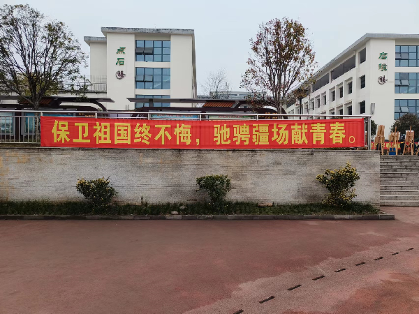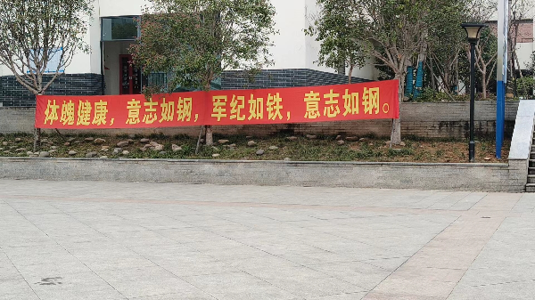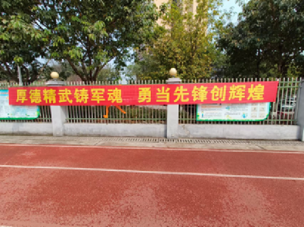 氛围营造: 比赛期间,学校打出醒目会标,悬挂励志标语,模拟军事化场景,项目间隙组织拉军歌,让校园处处洋溢着爱国尚军的正能量。