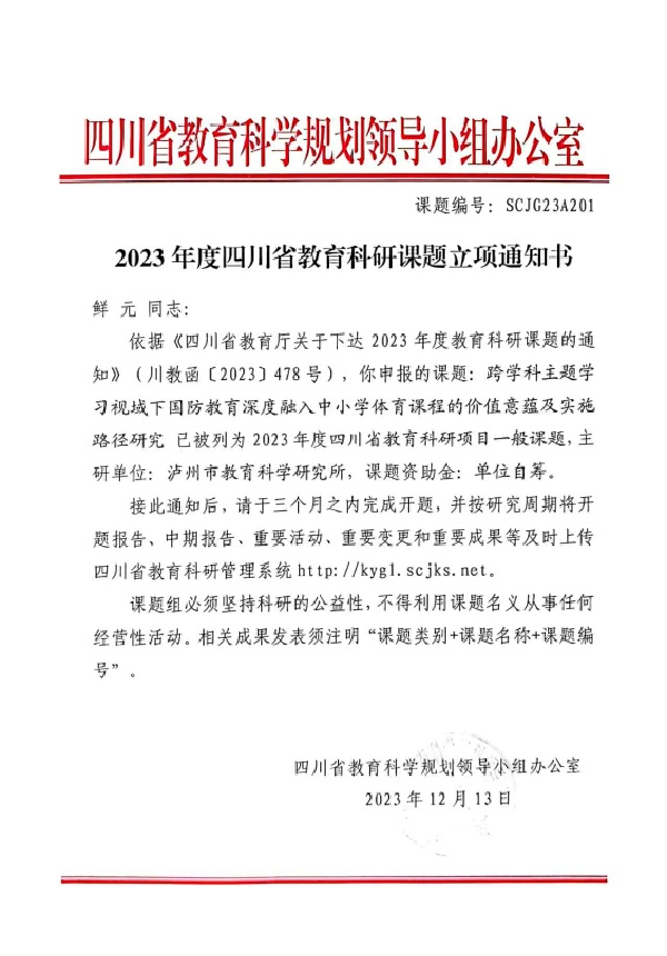 科研支持:中国教育学会“第六批体育与卫生(国防教育)”专项课题《新时代国防教育深度融入中小学体育课程的价值意蕴及实施路径研究》,四川省教育科研课题《跨学科主题学习视域下国防教育深度融入中小学体育课程的价值意蕴及实施路径研究》。