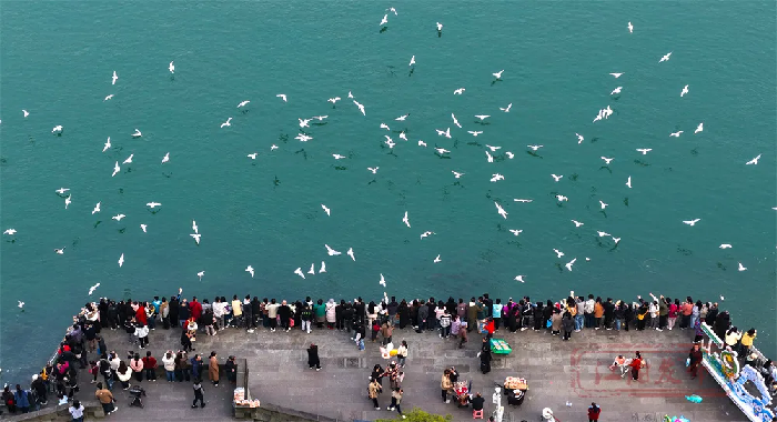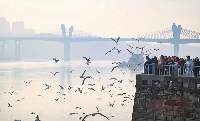市民在投喂时应避免频繁抛洒,或将面包远投,正确的做法是尽量靠近江岸,即抛投位置要靠近东门口石栏杆的下层台阶,引导红嘴鸥注意固定的“投喂区”,让其习惯到平台上取食。市民朋友如需帮助可以咨询现场泸州市绿芽环保志愿服务者。