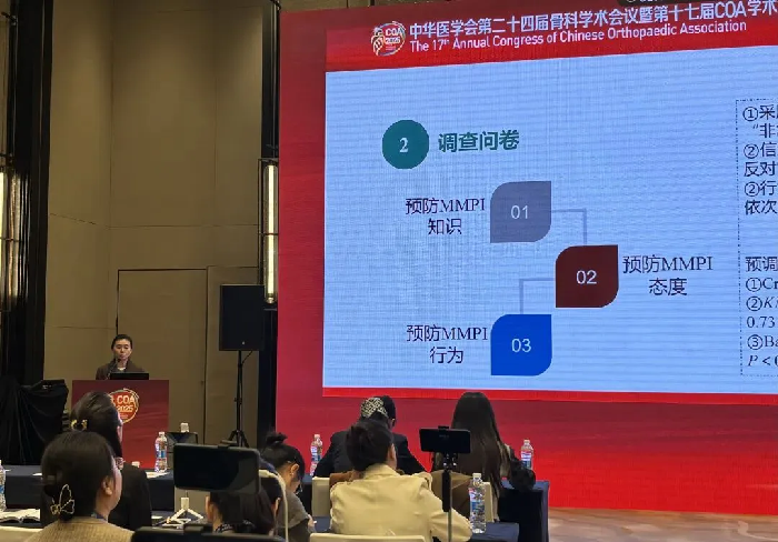 护理团队方面,骨与关节外科病区副护士长卿晨主管护师在骨科护理会场汇报了《临床护士预防患者黏膜压力性损伤的知信行现状及影响因素研究》,从护理认知与行为角度深入探讨了临床实际问题;