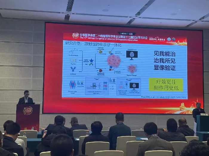 在骨肿瘤会场,他介绍了《68Ga-DOTA-IBA与18F-FDG、18F-NaF、99mTc-MDP在骨转移瘤中的诊断效能比较》,介绍西南医科大学附属医院核医学团队自主研发的新型骨靶向核素诊疗一体化药物在骨转移瘤中的应用价值,为临床诊疗策略提供了新思路。