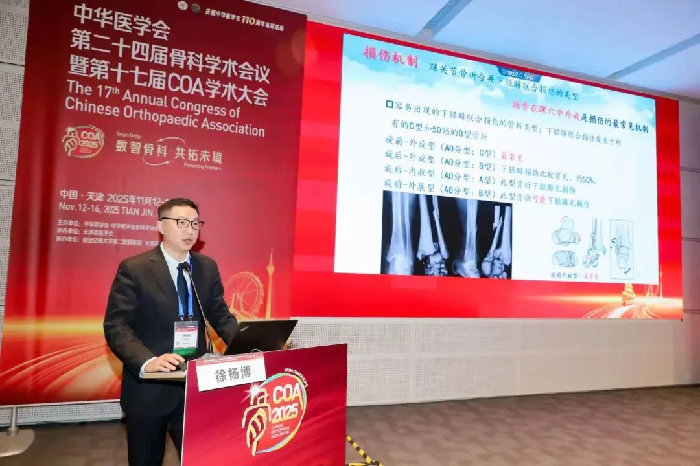 徐杨博教授在足踝会场分享《下胫腓联合损伤的治疗进展》,并担任该节段主持人。其报告内容聚焦学科前沿,展现了深厚的专业功底。