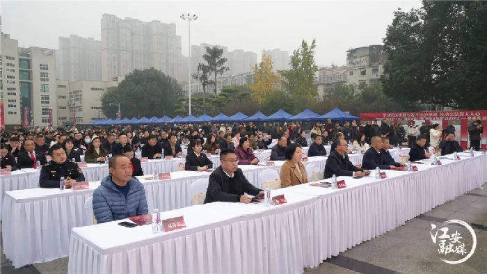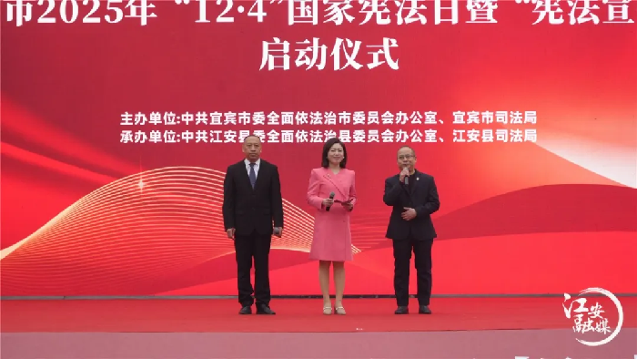 12月3日,宜宾市2025年“12·4”国家宪法日暨“宪法宣传周”启动仪式在江安县举行。宜宾市副市长、市公安局党委书记、局长黄金盛,市委依法治市办副主任、市司法局党组书记、局长杨国庆,江安县委书记张林,县委副书记、县长何益伟,县人大常委会主任蒋龙珍,县委副书记、江安经开区党工委书记杨宇出席活动。