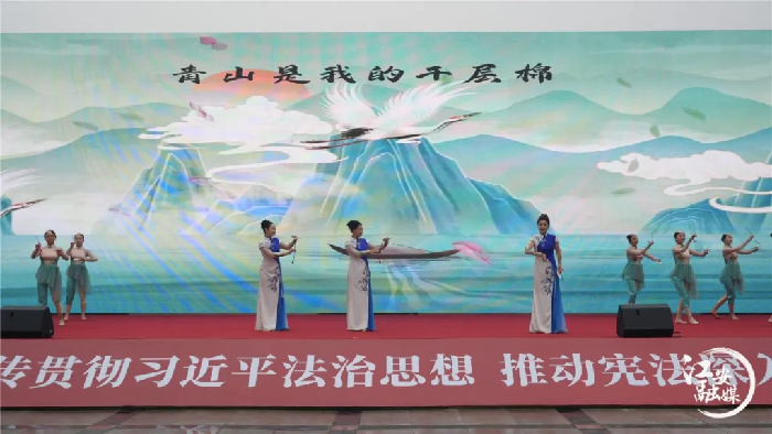 活动融合了法治文化与艺术表现形式。快板《话说法治宣传教育法》以轻快活泼的形式解读法律知识,舞蹈《花开时节》、四川盘子《百鸟声声》等文艺节目轮番上演,展现了法治文明与艺术之美的交融。现场展播了2024年获评“四川十大法治阵地”的宜宾宪法主题公园和“四川十大重点培育法治IP”——“宜小法”普法IP的宣传视频,展示了宜宾市在可视化、品牌化普法方面取得的创新成果。现场连线播放南溪、长宁、高县开展“12·4”国家宪法日暨“宪法宣传周”活动视频,体现了区域协同普法的合力。