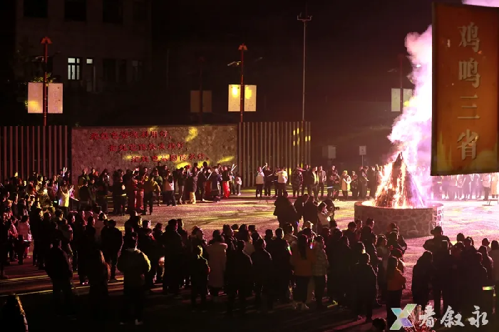 “苏木地伟喔(远方的贵宾),曲波果拉嗦(四方的朋友),你我嘎得嗦(我们不常聚),莫拉咯特波(难有相见时)……”伴着彝族歌曲,所有人手拉手,围着篝火跳起欢快的达体舞,火光映红了一张张笑脸。