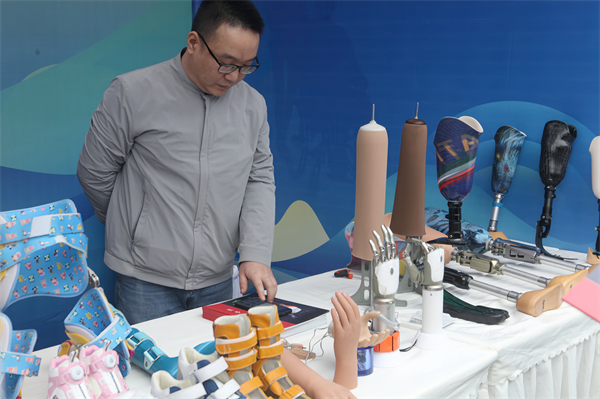 在残疾人辅具展示体验区,工作人员正手把手地向残疾人朋友演示智能辅具的使用方法。电动轮椅、假肢矫形器、智能康复设备等辅具整齐陈列,工作人员结合不同需求,详细介绍各类辅具的适配场景和功能优势,让大家直观了解辅具对改善残疾人生活的作用。
