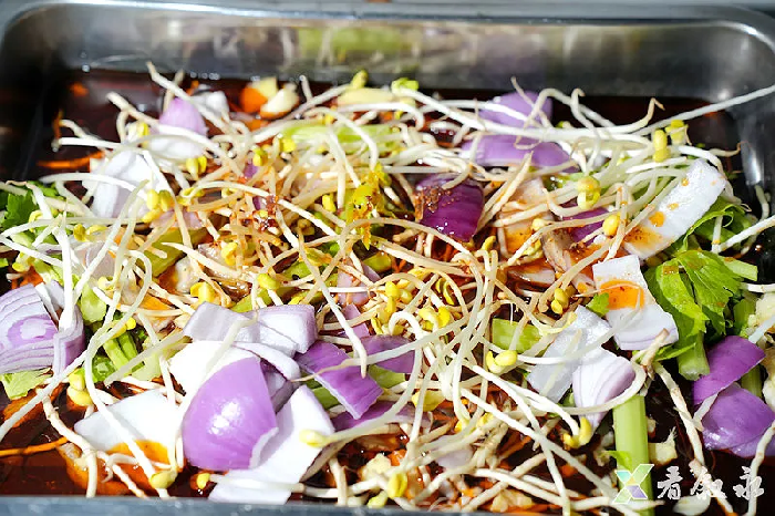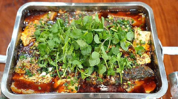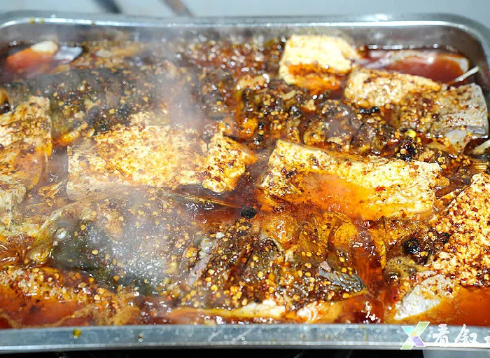 老板的话语里满是对食材的坚守,而这份坚守也体现在每一个制作细节中。处理干净的鱼身被师傅划上几道均匀的刀口,这样既能让酱汁更好地渗透,又能让炭火均匀烤制。随后,鱼身被浸入秘制酱汁中腌制,待充分入味后,便小心翼翼地架在炭火上慢慢烤制。不一会儿就听见炭火上滋滋作响,鱼肉的油脂缓缓渗出,表皮逐渐变得焦脆金黄,鱼肉的原始鲜香在炭火催化下被完全激发,诱人至极。待鱼肉烤至八九成熟,便转入铺垫了折耳根、洋葱、芹菜等香料的烤盘中,浇上滚烫的秘制红油汤汁,再加入新鲜的豆花。颤巍巍的豆花,嫩得仿佛一触即碎,在炭火的持续加热中,慢慢吸收着麻辣鲜香的汤汁,原本清淡的豆香与烤鱼的浓郁味道完美融合,鲜而不腻、辣而不燥,风味格外特别。