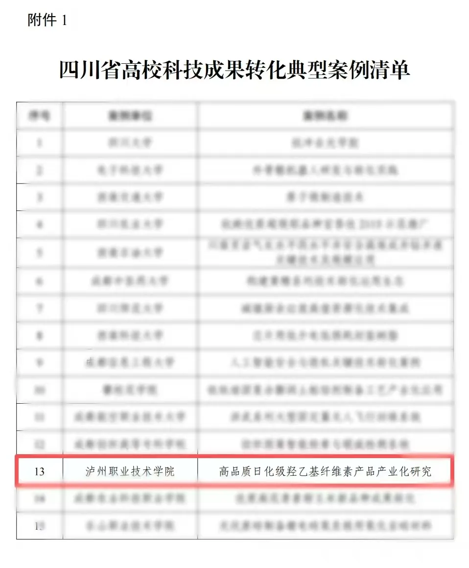 近日,四川省教育厅公布全省高校科技成果转化典型案例评选结果,泸州职业技术学院科技特派团龚勇教授团队的《高品质日化级羟乙基纤维素产品产业化研究》项目成功获评典型案例,全省仅15所高校入选,标志着学校在服务产业、推动成果转化方面取得显著成效。
