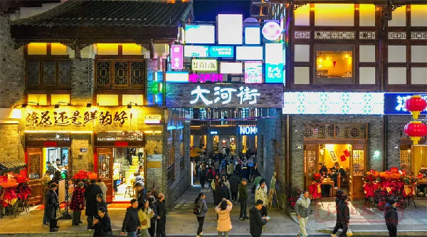修缮一新的绣楼下,Nomo咖啡的香气与传统糯食奇妙邂逅。“黄粑美式”“桂花白糕拿铁”或“泸州味道dirty”,成为传统与新潮的友好握手,诠释着大河街包容并蓄的生命力。而酒城烤事的烟火气与渝城记老火锅的沸腾,则为夜晚注入了酣畅淋漓的活力。