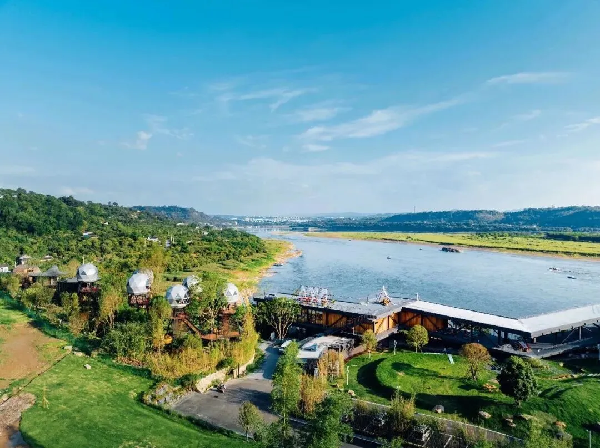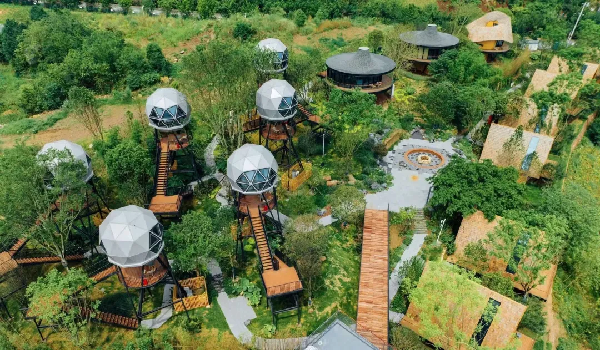 位于黄舣镇的“碧水林滩”,以三角树屋、穹顶玻璃房等特色住宿吸引乐迷延长停留。音乐节期间,部落推出“星空音乐宿营”活动:乐迷可在百亩长江自然探索营地搭建帐篷,通过露天电影放映、篝火晚会延续音乐氛围;参与油纸伞彩绘、蔬果采摘等亲子项目,让家庭游客找到专属乐趣。