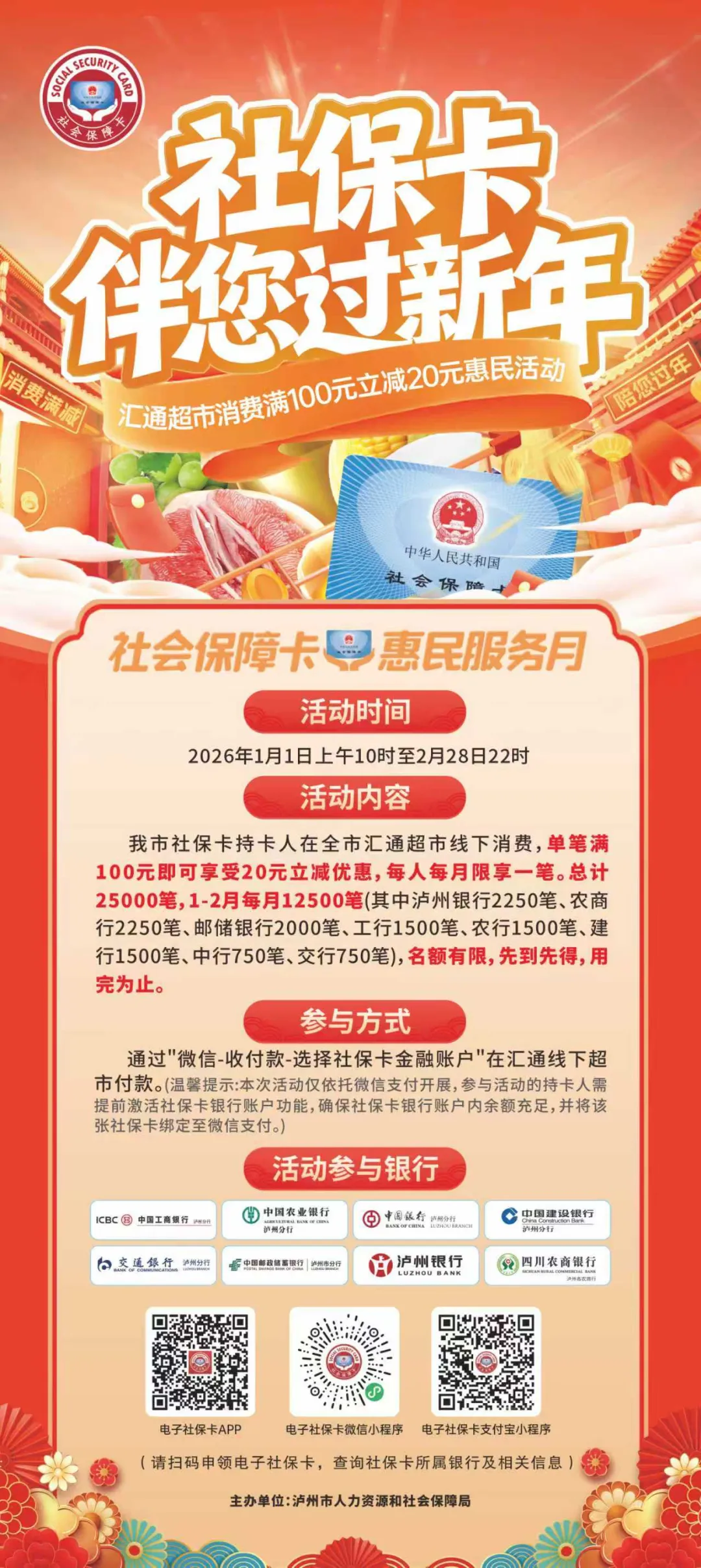 答:凡在我市就业、参保或享受其他民生服务权益的个人(含未成年人),均可以按照省内“一人一卡”的原则,本人持有效居民身份证(未成年人须监护人持有效居民身份证、未成年人户口簿、出生医学证明等)到我市社保卡合作银行(工行、农行、中行、建行、交行、邮政储蓄银行、泸州银行、农商行)任一经办服务网点或者通过掌上12333APP、电子社保卡APP或电子社保卡支付宝、微信小程序等线上服务渠道申领社会保障卡(目前线上申领支持工行、建行、农行、邮政储蓄银行)。申领人可通过“泸州市人力资源和社会保障局官网—专题专栏—金保工程“查询全市社保卡合作银行经办服务网点信息。