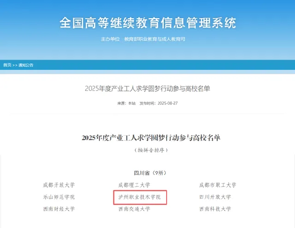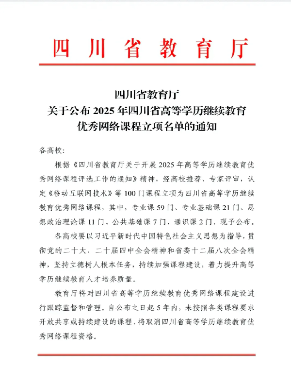近日,四川省教育厅公布2025年四川省高等学历继续教育优秀网络课程立项名单,泸州职业技术学院4门课程成功入选。
