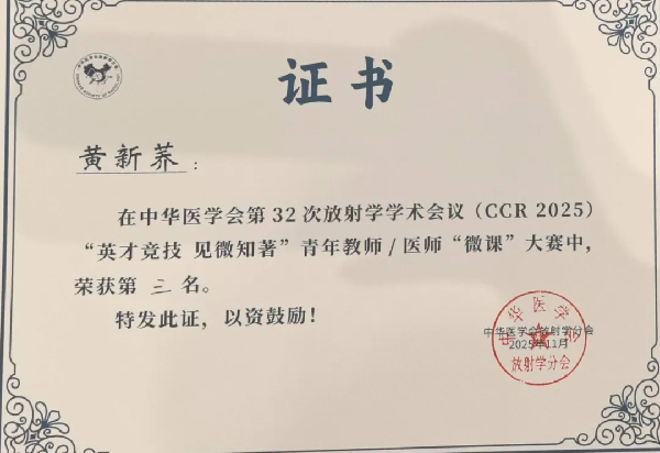 博士生刘炯获得青年学组中文演讲比赛第一名,黄新荞在中华医学会放射学分会举办的“英才竞技见微知著”青年教师/医师“微课”大赛中,荣获第三名;研究生刘炯、李彦滨2人获得大会发言、18人获得壁报交流、15人获得书面交流。
